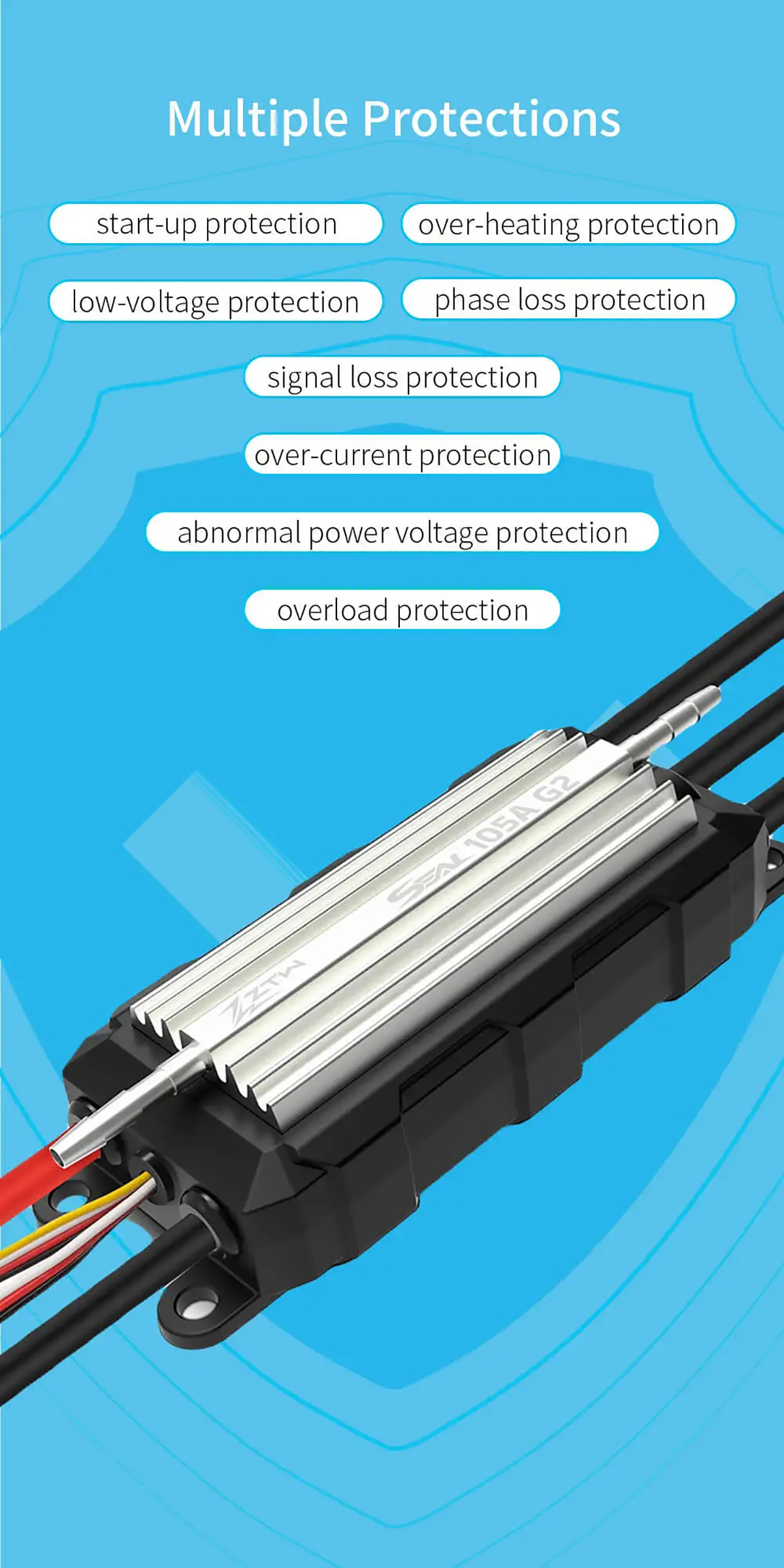 Multiple protections: start-up, over-heat, low-voltage cutoff, signal loss, phase loss, over-current, abnormal power-on voltage, over-load protection.