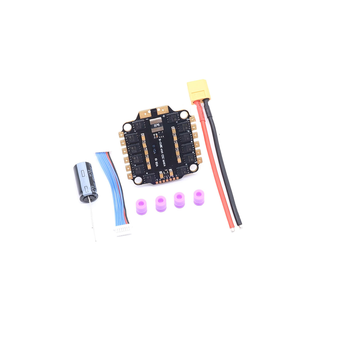 The ESC has filter capacitors on board to suppress the electromotive power transmission, stabilize the battery voltage and protect the components of ESC vuelo control precision