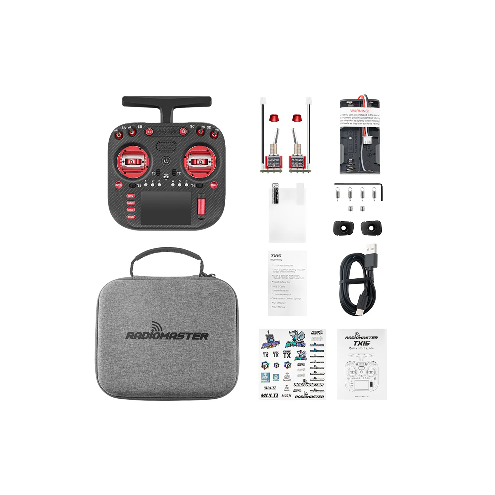 Enjoy sharp visuals on the 3.5-inch IPS touchscreen with 262k color resolution and 600 nits brightness, even in sunlight. The TX15 MAX boasts AG02 CNC aluminum gimbals in anodized red, black or gold, upgraded aluminum buttons, a scroll wheel, and a carbon-fiber-look case for a premium feel. Integrated RGB LED lights around the gimbals allow customizable LUA-controlled lighting. It includes advanced cooling, a USB-C charging port, SIM connectivity, firmware updates, and fast memory access for top-tier performance. We’ve included additional switches so you can swap out the shoulder buttons with either a momentary or two-position latching switch—perfect if you prefer a traditional switch over a button. Prefer the standard model? See the TX15 Standard.